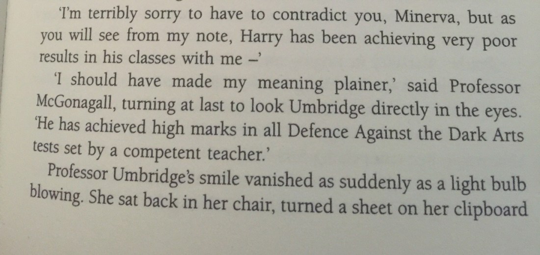 My favorite part about that line is that it implies that Gilderoy Lockhart was a more competent teacher than Dolores Umbridge. And that may be the biggest insult in the entire series.
